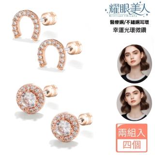 【耀眼美人】幸運光環玫瑰金微鑽後鎖/不鏽鋼雙鋯石鑽耳環(女王節/過爐款/鈦鋼/雙鋯石鑽轉式耳環)