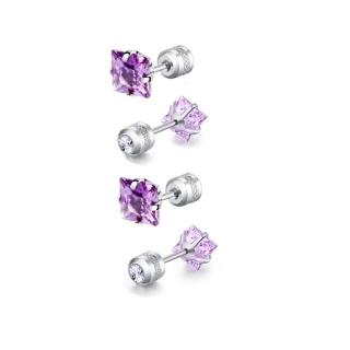 貴氣紫公主方鋯石鑽鈦閃耀不鏽鋼耳環兩組入(女王節/造型/過爐款/美容美感品味)