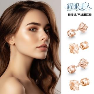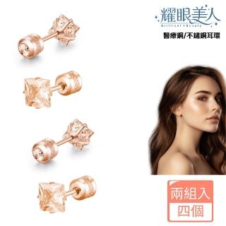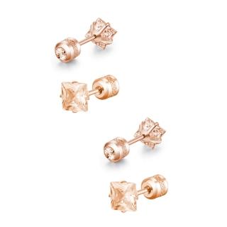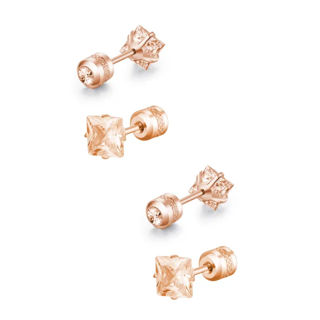 閃耀公主方玫瑰金香檳鋯石鑽鈦閃耀不鏽鋼耳環兩組入(女王節/造型/過爐款/美容美感品味)