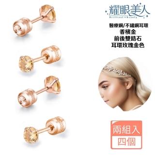 【耀眼美人】香檳金雙鋯石鑽鈦閃耀不銹鋼耳環兩組入(女王節/睡覺免摘/造型美容美感品味)