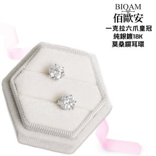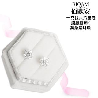 【BIOAM 佰歐安】一克拉莫桑鑽耳環六爪皇冠純銀鍍18K一對入(女王節/過爐款/莫桑鑽耳環/不過敏)