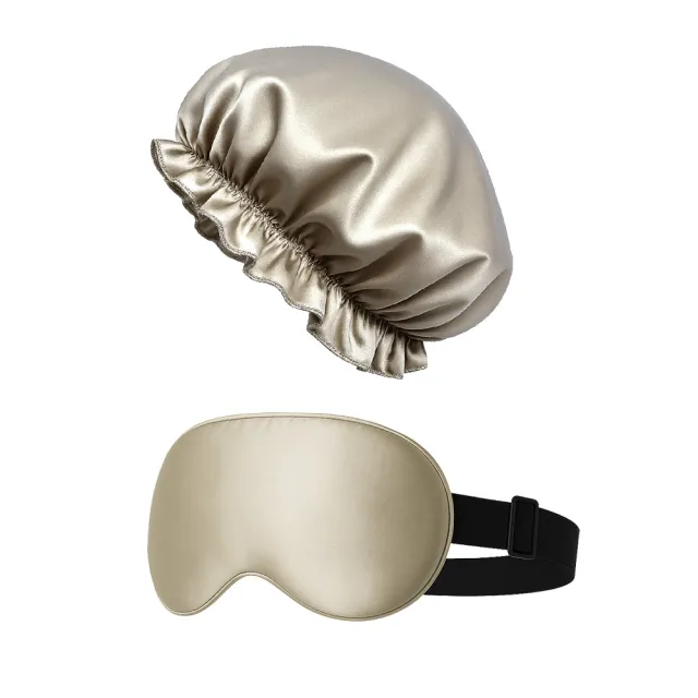 【BIOAM 佰歐安】天然蠶絲大尺寸舒眠眼罩護髮帽香檳金套組(蠶絲眼罩護髮帽/防靜電護髮睡眠/女王節)
